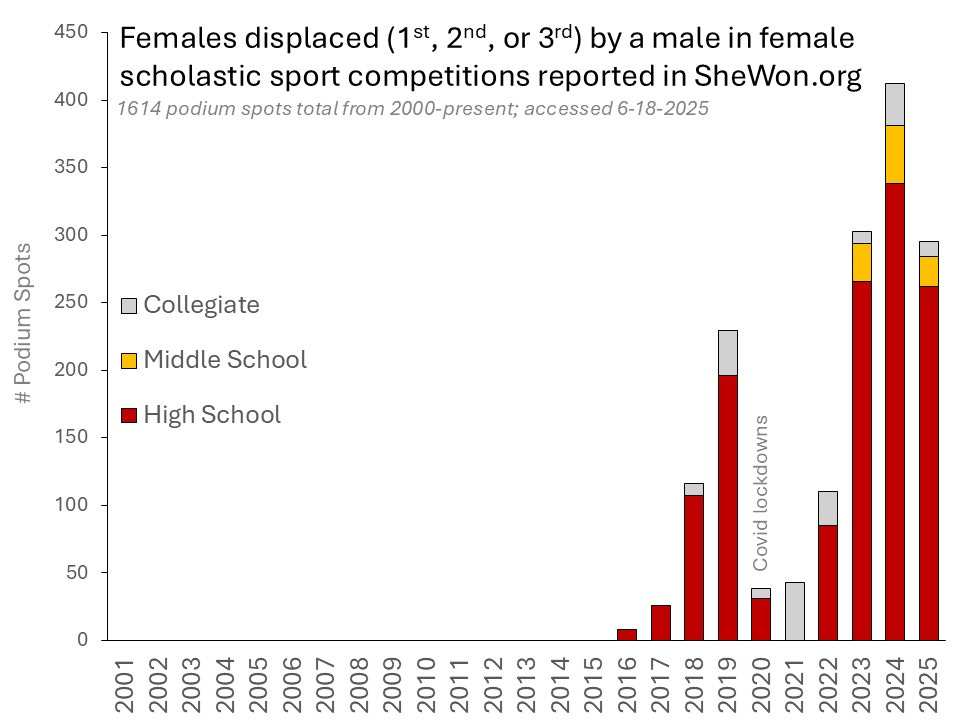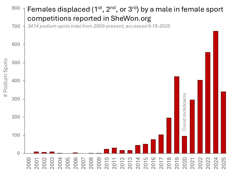 Politicians and sports organizations are making policy decisions regarding gender inclusion in female sports without understanding—or even showing curiosity about—the consequences for women and girls. Even with incomplete data, SheWon underscores the scale of female displacement and the need for transparent, systematic documentation to assess the real impact of so-called gender-inclusive policies on women’s sports. This is especially important given the rise in the number of trans-identified males competing in female categories in the last decade, and the impact even a single male athlete can have.