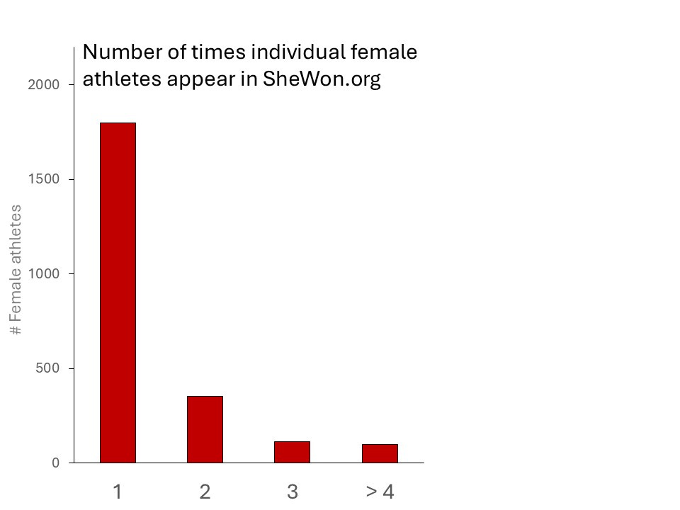 The “tiny minority” argument implies that the impact on girls and women must be negligible. Yet a single male athlete can have a huge impact. For example, Terry Miller, a male high school runner from Connecticut, is linked to 211 entries in SheWon. While most women and girls seem to compete only once against a male athlete, nearly a quarter of the female athletes identified by SheWon appear two or more times, reflecting multiple losses to the same boy or man in numerous events. One woman was displaced at least twelve times to one or more males.