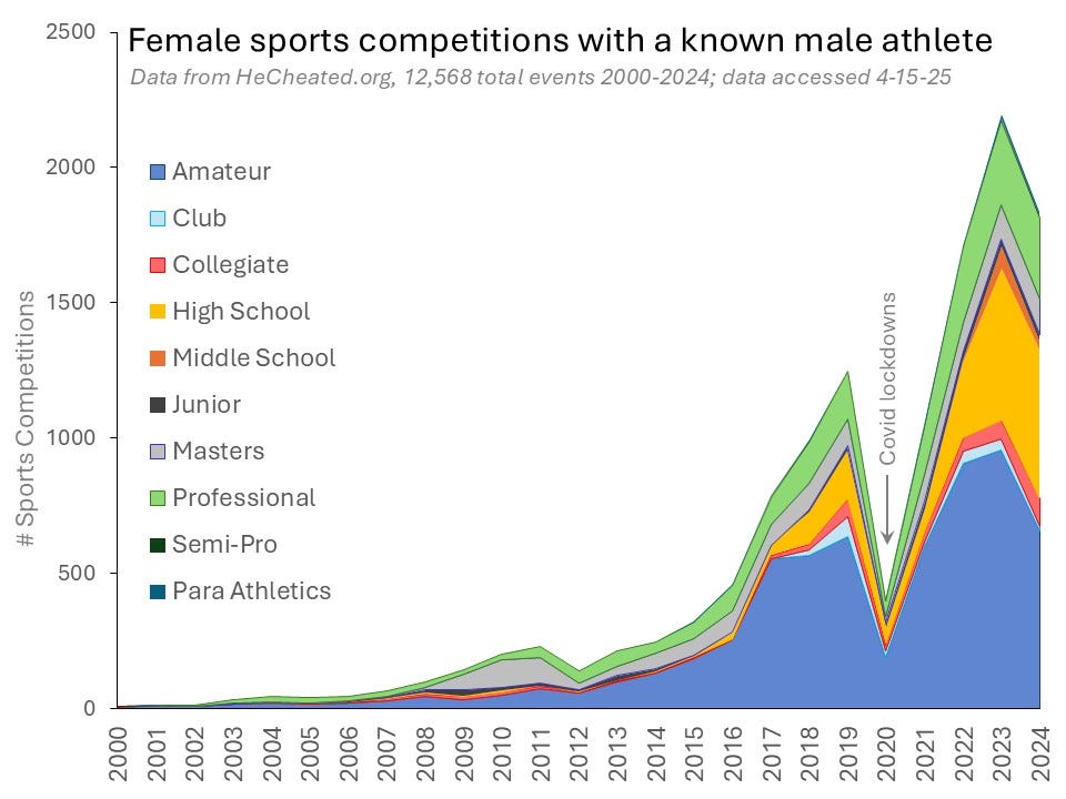 Since 2015, there has been a sharp increase in male participation in female sports, with 95 percent of SheWon entries occurring in the last decade.